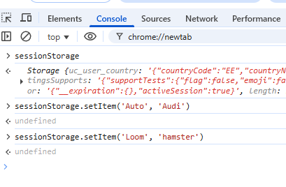 Andmed salvestatakse Session Storage’i ainult konktreetse brauseriseansi jooksul. Kui kasutad sessionStorage.setItem() jne käske, siis need kehtivad ühe seansi kohta. Teine vahekaart, mille avasid punkti 7 juures