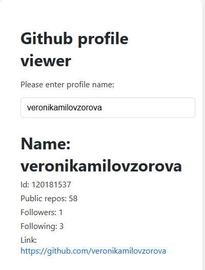 On loodud leht mis teeb pätingu GIThubi ja näitab valiku infot (ID, ava repos, link, followers).